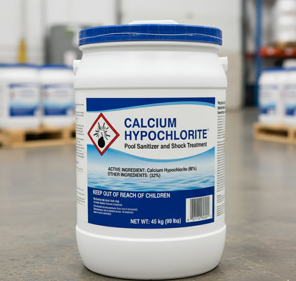 Calcium hypochlorite (Ca(ClO)₂) is a white, solid disinfectant and bleaching agent commonly known as "bleaching powder" that is widely used to sanitize swimming pools and drinking water, and as an industrial sanitizer. While stable in dry conditions, it decomposes in moist air, giving it a strong chlorine smell. It is an effective broad-spectrum antimicrobial agent and also serves as an oxidizing agent in organic chemistry. Calcium hypochlorite is used for water purification, pool sanitation, bleaching, disinfection, algae and fungus control, odor removal, and emergency water treatment.